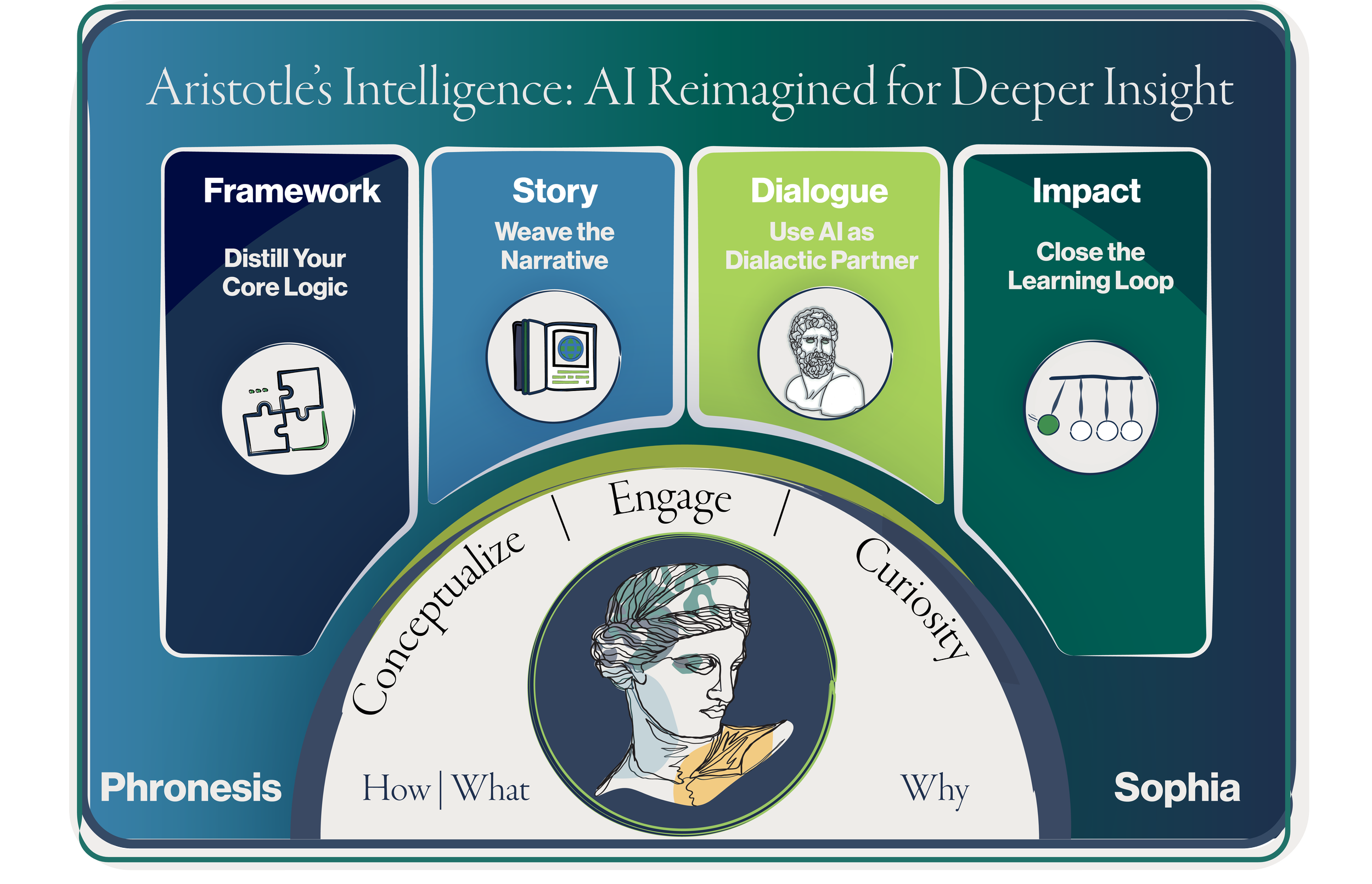 Aristotle's Intelligence: AI Reimagined for Deeper Insight. This model outlines the four pillars—Framework, Story, Dialogue, and Measurement—essential for cultivating wisdom and strategic judgment through AI-powered conversation.