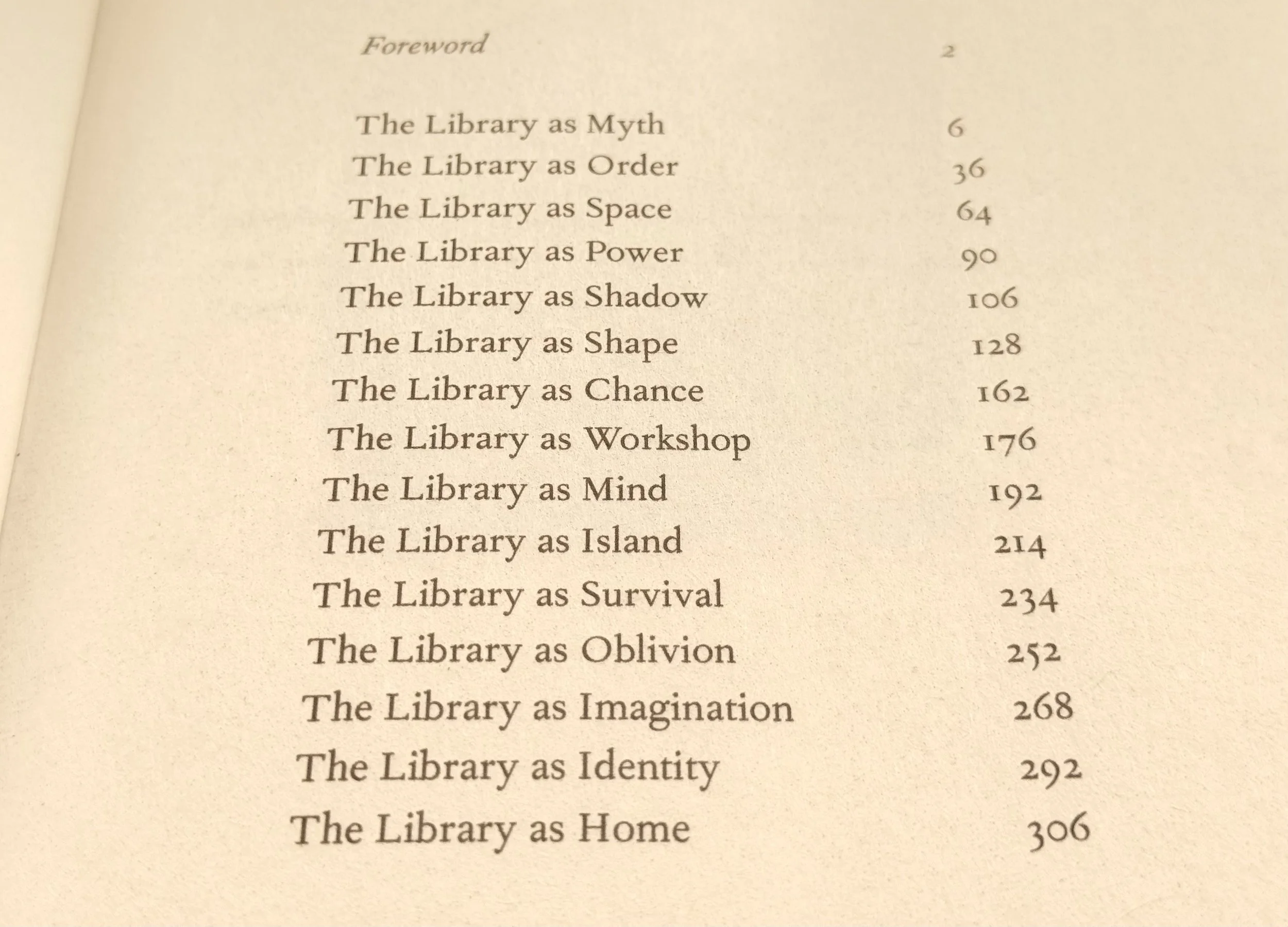 Alberto Manguel saw a library ‘not as a place to preserve books but as a reader’s workshop’. He titled the chapters of The Library at Night as sixteen declarations, casting the library as Myth, as Order, as Space, as Power, as Shadow, as Shape, as Chance, as Workshop, as Mind, as Island, as Survival, as Oblivion, as Imagination, as Identity, as Home.